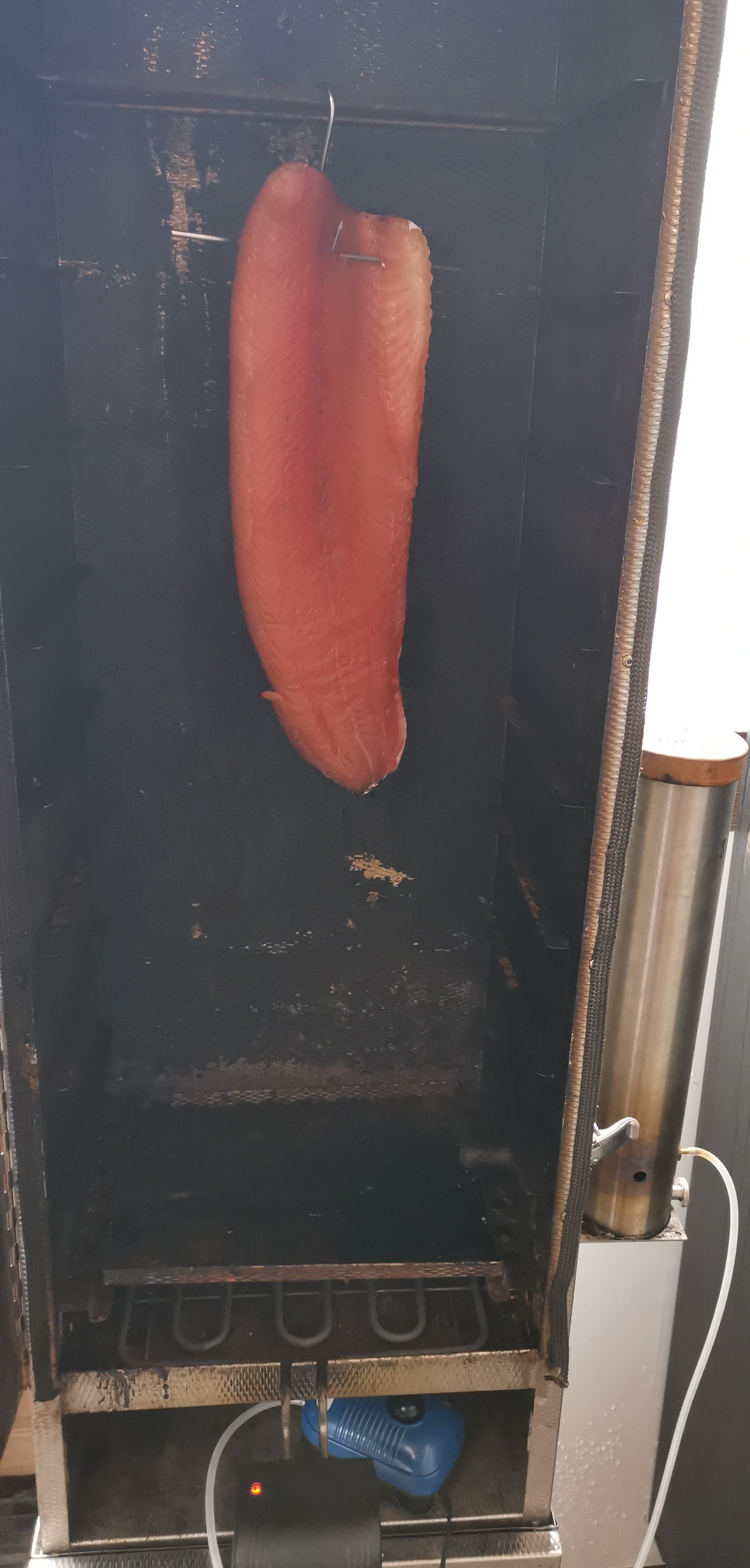 Das Lachsfilet bei maximal 25 Grad 8 Stunden lang mit Woodchips aus Buche und Erle kalträuchern. Dabei ist – wie immer beim Kalträuchern – zu beachten, dass die Räucherkammer oben und unten offen ist, um eine gute Zirkulation zu ermöglichen. Dies ist eins der wichtigsten Dinge beim Kalträuchern, um das Schwitzen des Räucherguts zu vermeiden. Zusätzlich empfehlen wir eine Wärmequelle zuzuschalten, um eine konstante Temperatur von 25 Grad zu erreichen. Das gelingt zum Beispiel mit einer regelbaren Heizspirale oder Brennpaste.