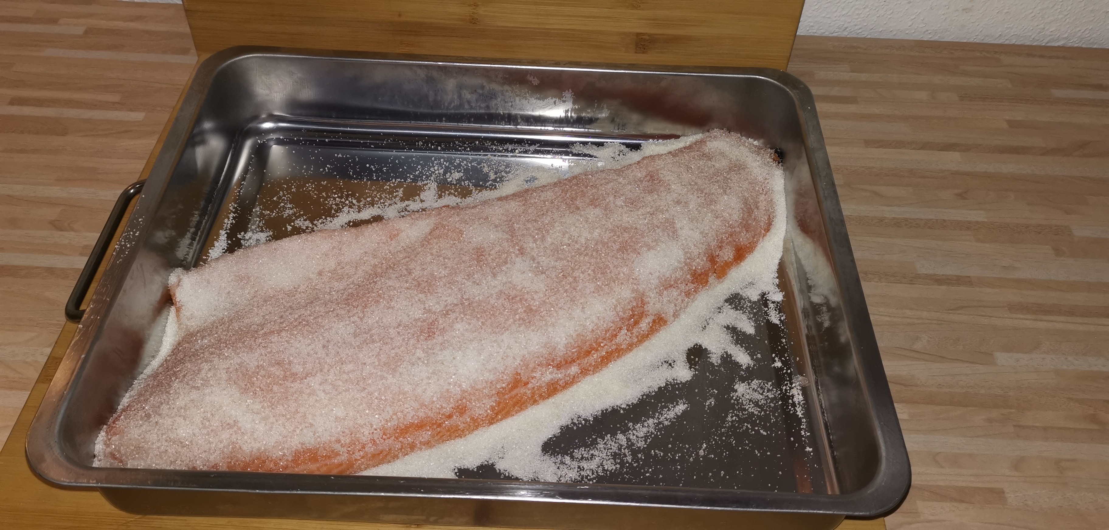 Flaches Gefäß zur Hand nehmen und den Boden mit der Hälfte der Salz-Zucker-Mischung bestreuen. Dann das Lachsfilet mit der Haut nach unten auf die Salz-Zucker-Mischung legen. Die restliche Salz-Zucker-Mischung gleichmäßig auf das Lachsfilet auftragen und einreiben, anschließend das Ganze für 8-12 Stunden in den Kühlschrank stellen, damit dem Filet das Wasser entzogen wird.