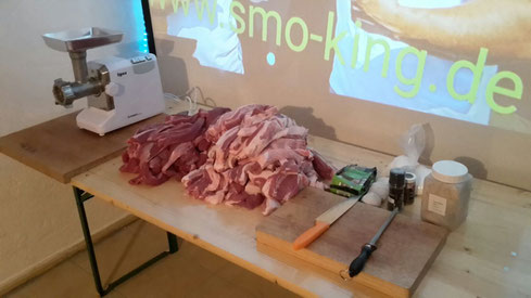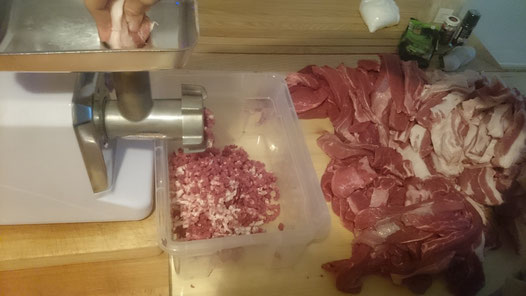 - Wir nehmen dazu 50% Schweinebauch und 50% Rinderbratenfleisch