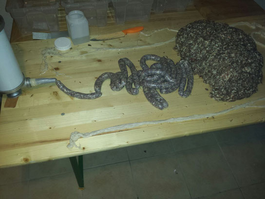 - Füllen Sie immer ca. 1 Meter lange Würste ab, drücken sie mit zwei Händen immer bei ca. 20cm den befüllten Darm ab und umschlagen die ca. 20cm Wurst 3 mal, Fertig sind die Würste, (Arbeitserleichterung).