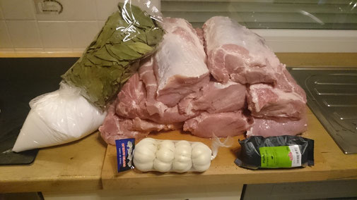 Nach 1-2 Wochen geht es nun endlich weiter. Jetzt wird das Fleisch aus dem Fass genommen und gut mit kaltem Wasser abgespült, damit das überschüssige Salz verschwindet.