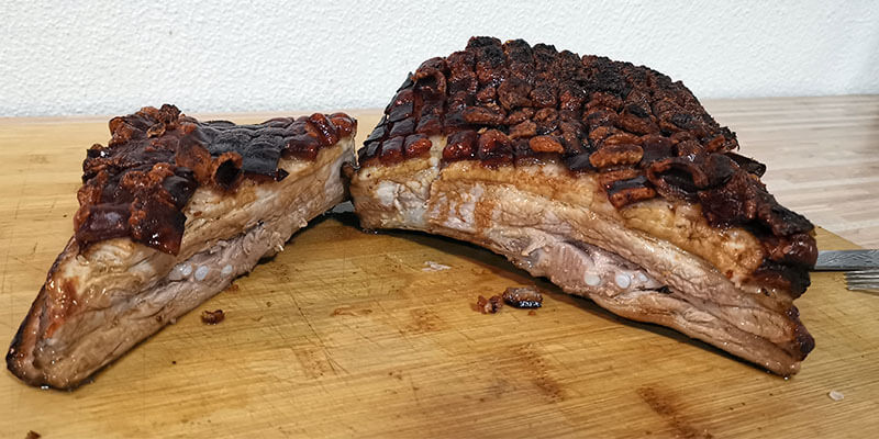 Kaltgeräucherter Knusperbauch mit Rinderfond im Backofen